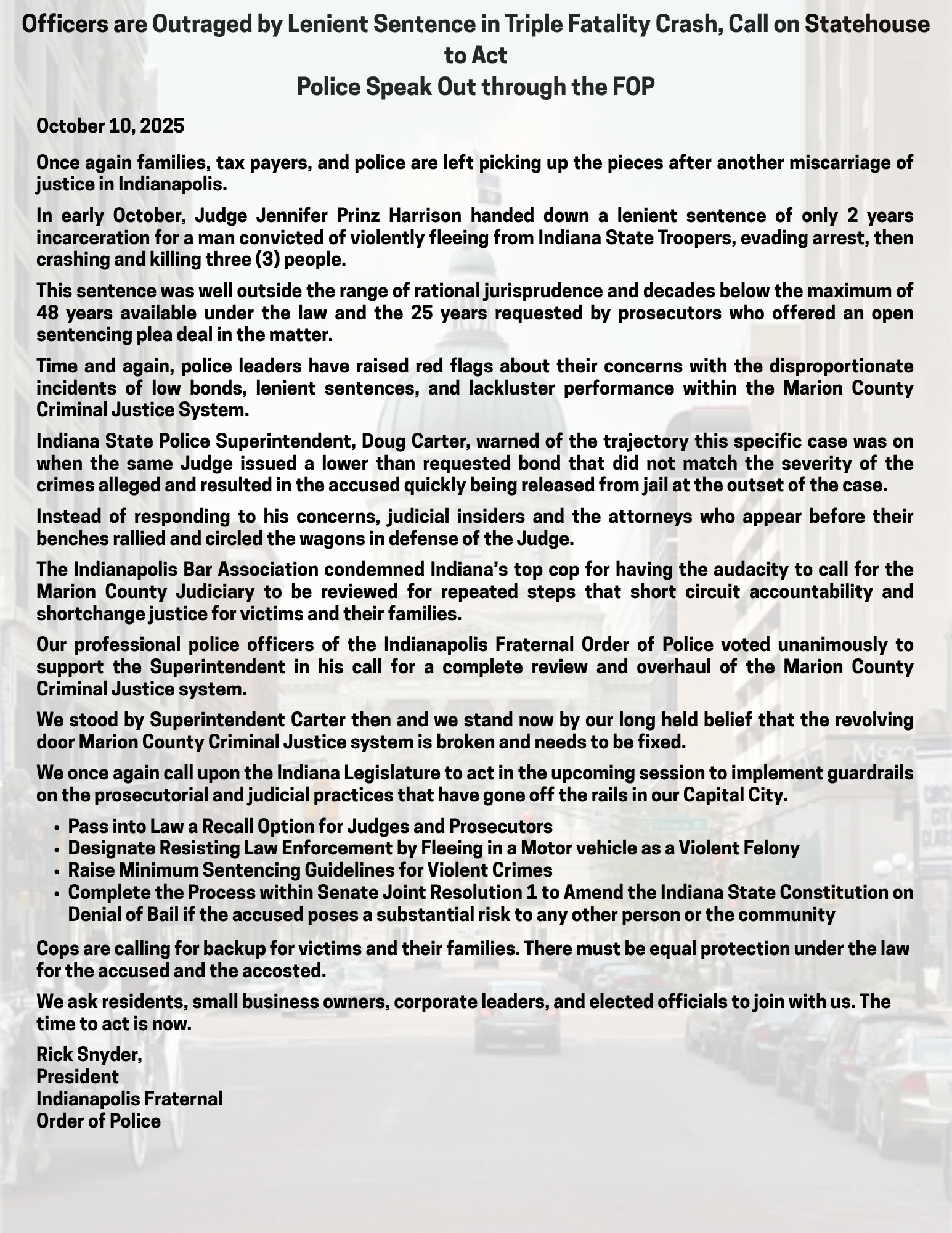 ©2020 Indianapolis Fraternal Order of Police, Lodge #86 All Rights Reserved. This video, written message, image, or other material is protected under the laws of the United States and other countries. Unauthorized duplication, distribution, or exhibition without expressed written permission may result in civil liability and criminal prosecution.